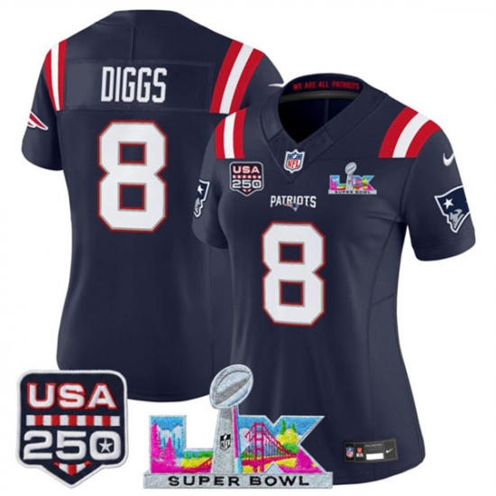 Home>NFL>2025 2026 Super Bowl LX>New England Patriots>Women New England Patriots 8 Stefon Diggs Navy 2025 F U S E Super Bowl LX Patch And USA 250 27 Patch Vapor Limited Football Stitched Jersey