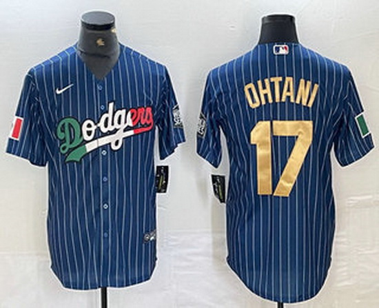 Men Los Angeles Dodgers 17 Shohei Ohtani Mexico Blue Gold Pinstripe Cool Base Stitched Jersey