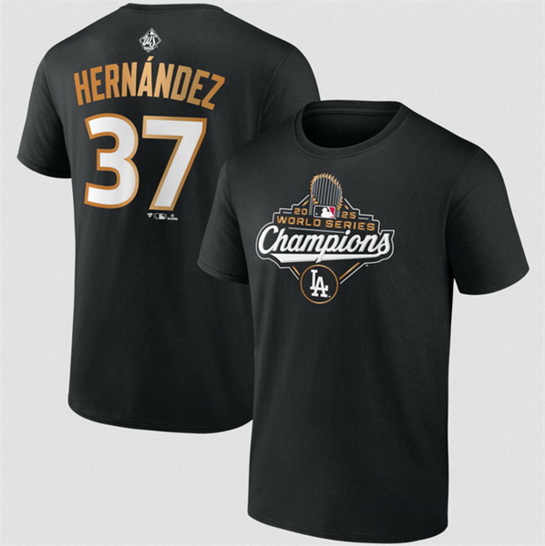 Men Los Angeles Dodgers 37 Teoscar Hernandez Black 2025 World Series Champions Name 26 Number T Shirt
