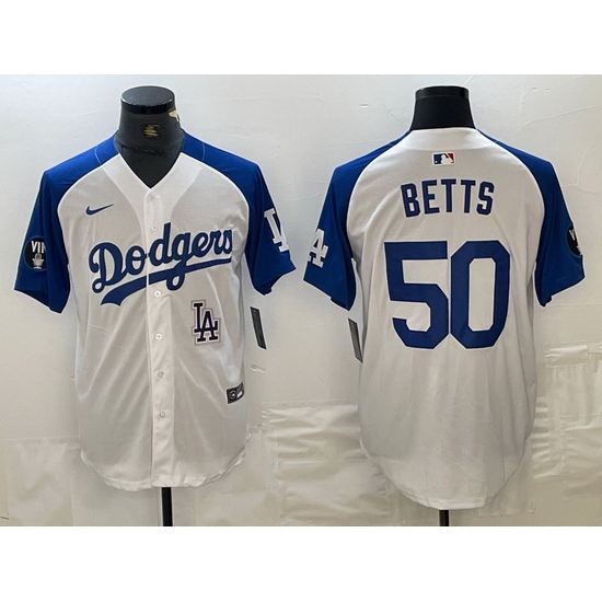 - Men Los Angeles Dodgers 50 Mookie Betts White Blue Split Cool Base Stitched Baseball Jerseys
