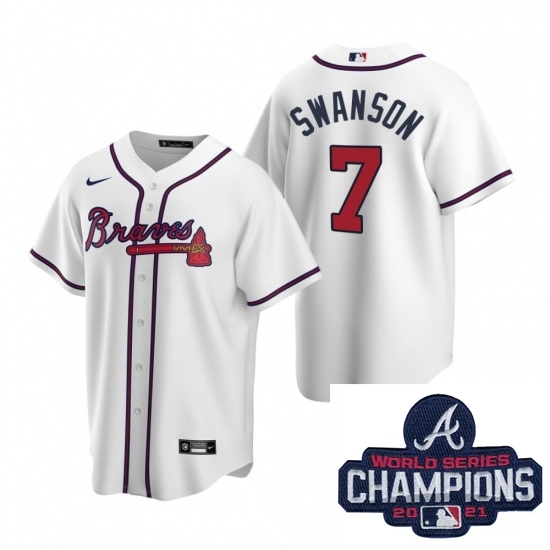 Home>MLB>2021 World Series >Atlanta Braves>Men Nike Atlanta Braves 7 Dansby Swanson White Home Stitched Baseball Stitched MLB 2021 Champions Patch Jersey