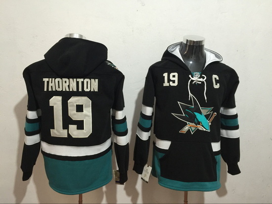 - Men San Jose Sharks 19 Joe Thornton Black Sawyer Hooded Sweatshirt Stitched NHL Jersey