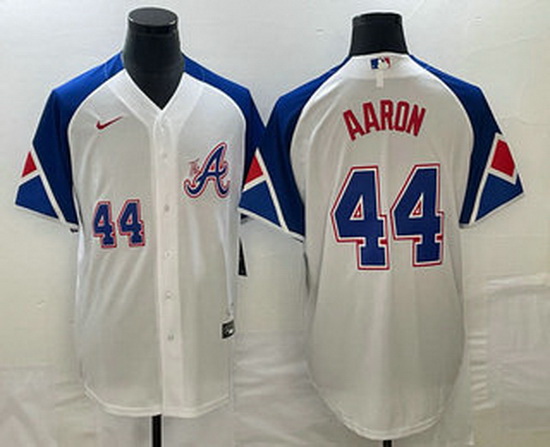 - Men's Atlanta Braves #44 Hank Aaron White 2023 City Connect Flex Base Stitched Jersey