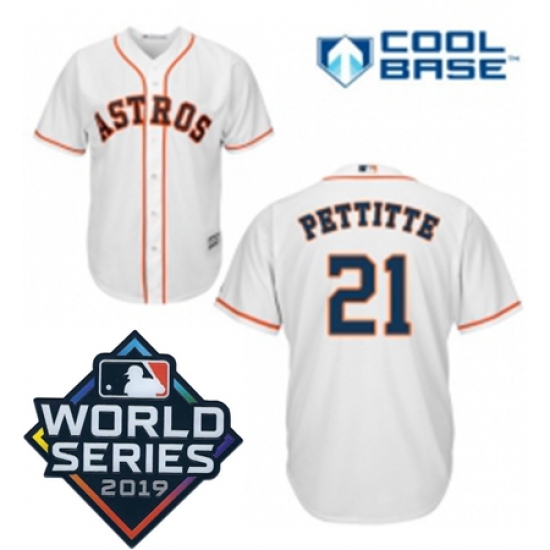 Home>MLB>2019 World Series>Astros Cool Base>Mens Majestic Houston Astros 21 Andy Pettitte Replica White Home Cool Base Sitched 2019 World Series Patch Jersey
