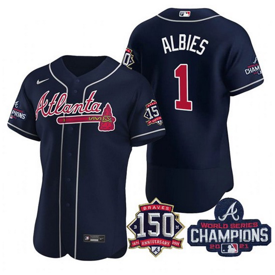Men's Navy Atlanta Braves #1 Ozzie Albies 2021 World Series Champions With 150th Anniversary Flex Base Stitched Jersey