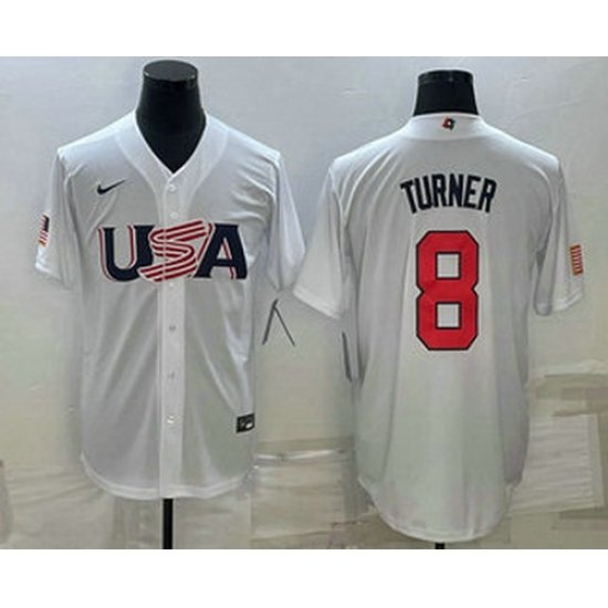 - Men's USA Baseball #8 Trea Turner 2023 White World Baseball Classic Stitched Jersey