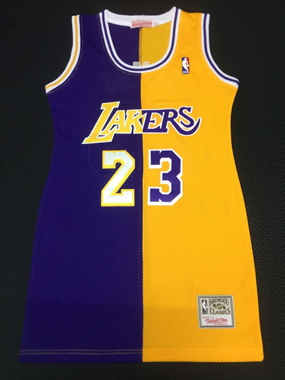 - Women Los Angeles Lakers 23 Lebron James Dress Stitched Jersey Yellow Purple Split II