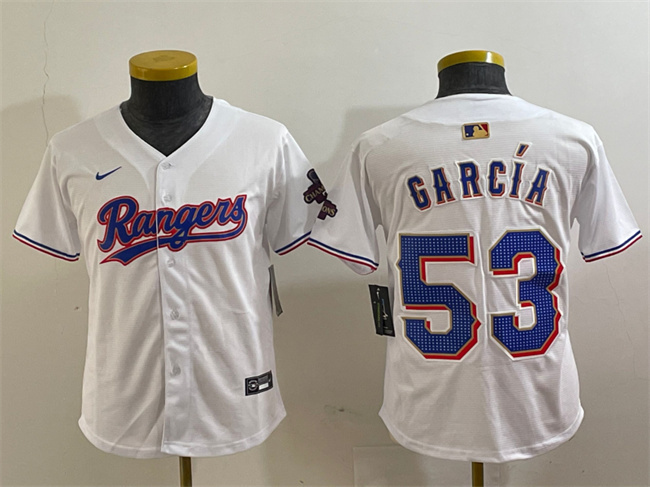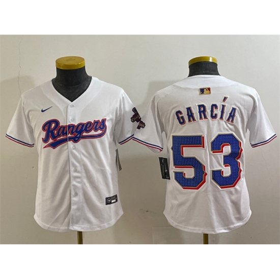 - Youth Texas Rangers 53 Adolis Garcia White Gold Cool Base Stitched Baseball Jersey